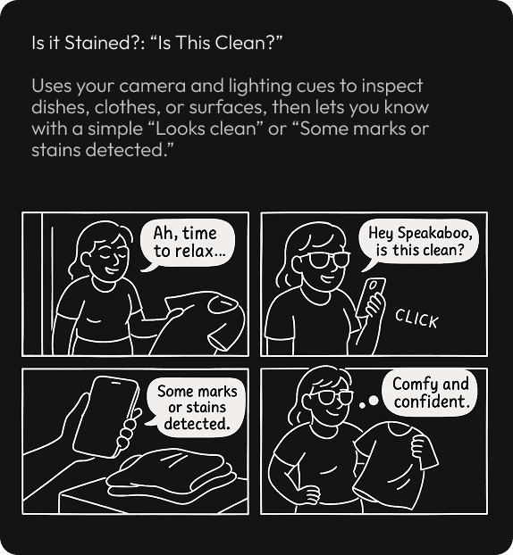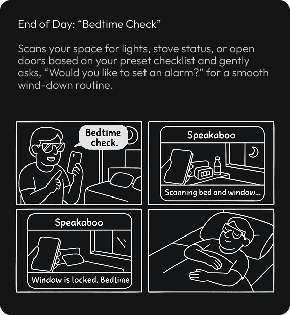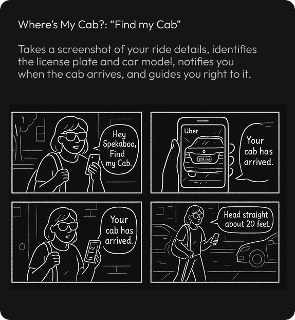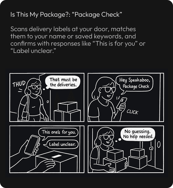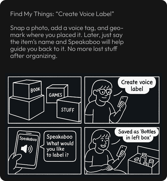 Using spatial mapping, Speakaboo detects and identifies nearby objects like doors, furniture, or key landmarks and delivers precise directional feedback through sound and vibration. This helps users locate and approach objects faster, minimizing uncertainty in unfamiliar spaces.