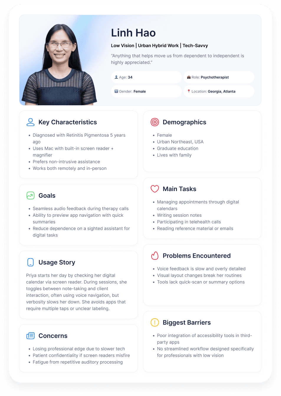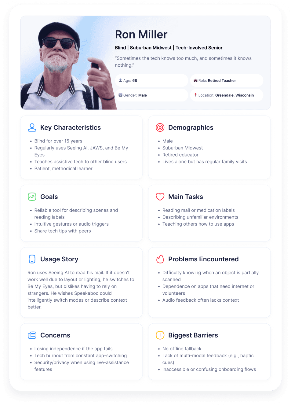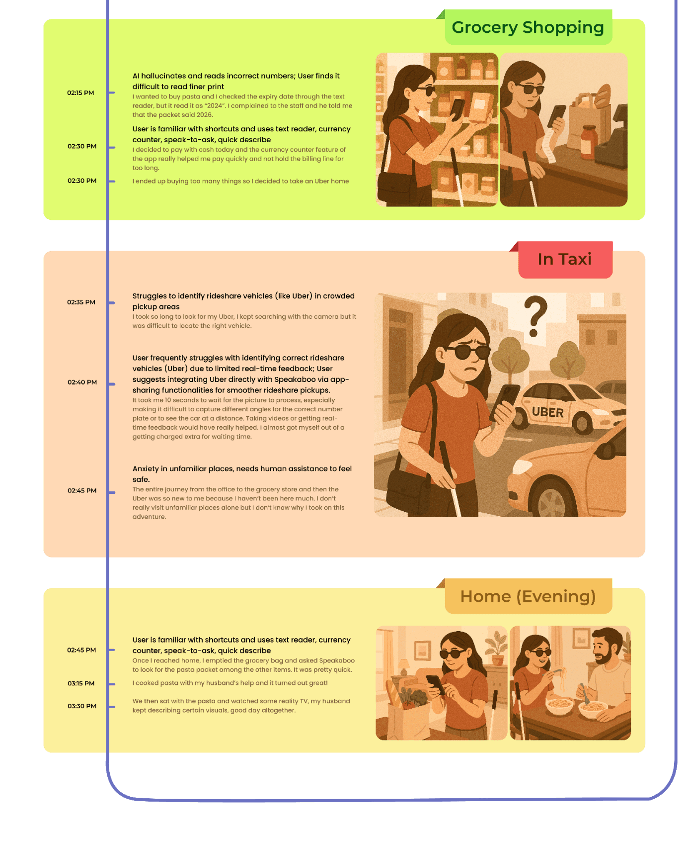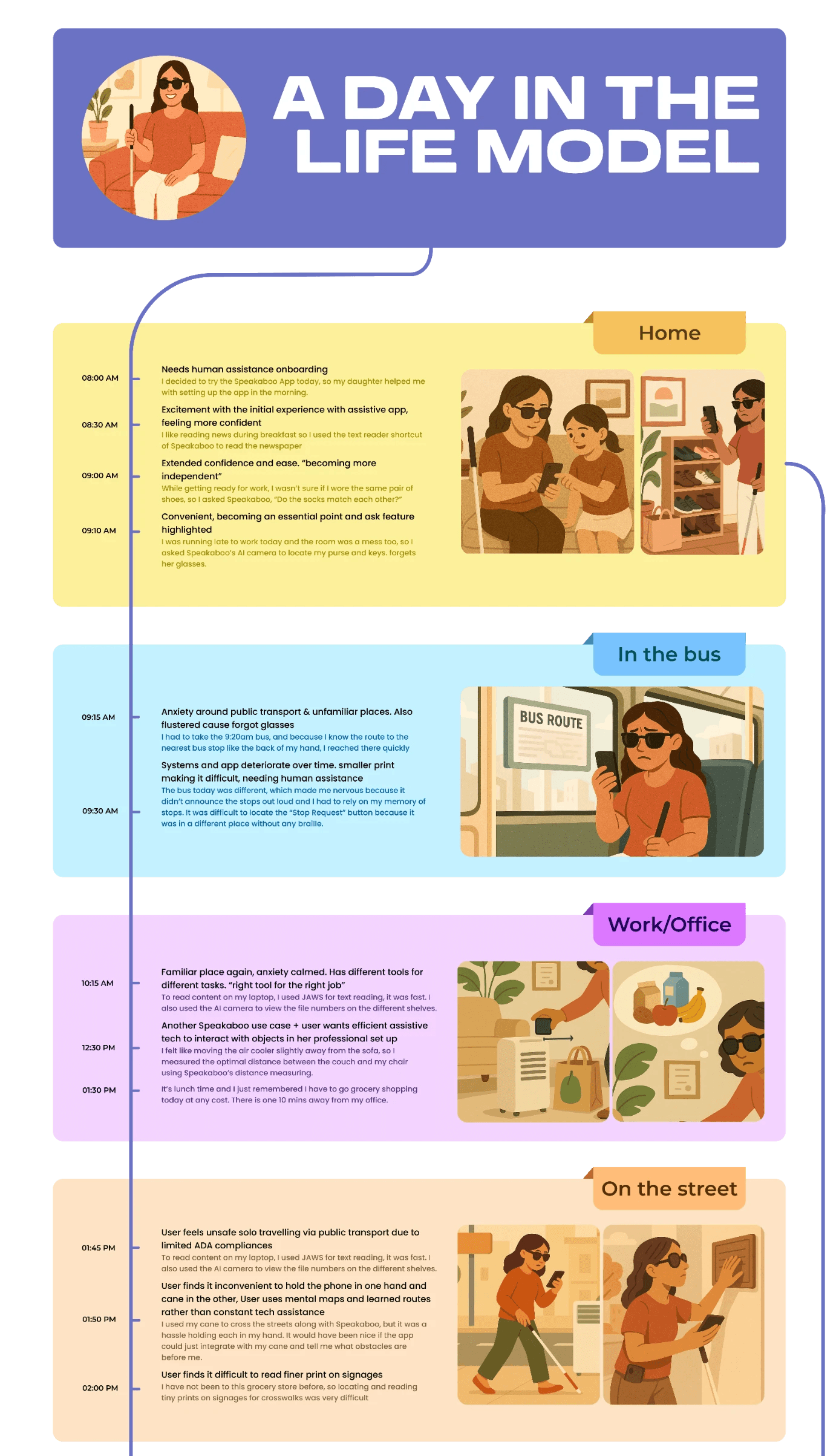 I conducted 8+ interviews and storytelling sessions with people who are blind or have low vision to understand their lived experiences and daily challenges.