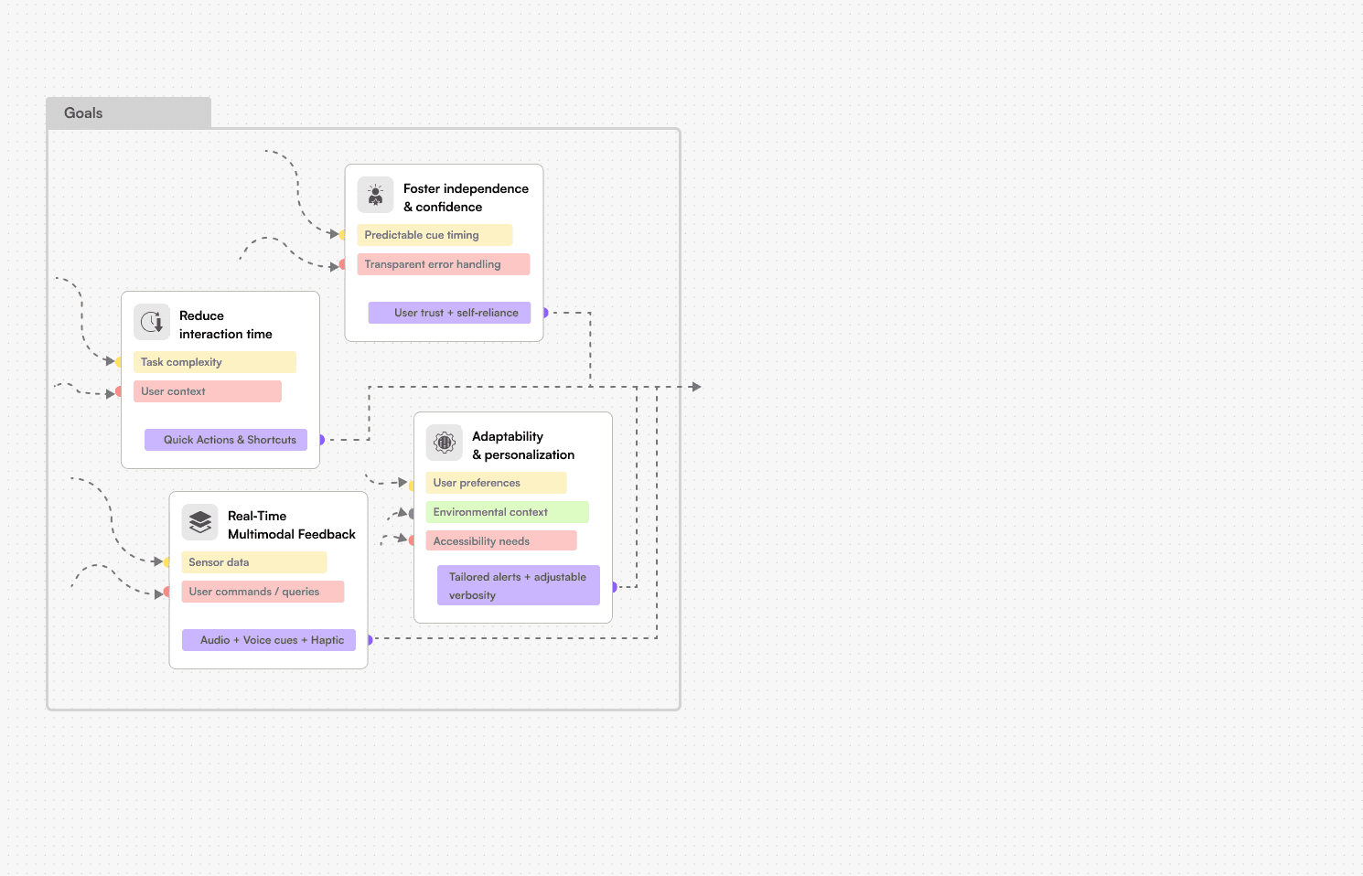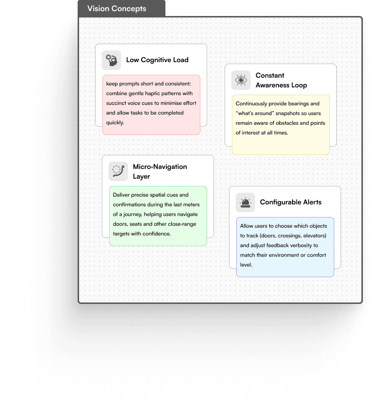 Low-vision users guided how we balanced visual and auditory awareness, blind users defined trust and feedback timing, and caregivers influenced setup simplicity and learning flow.