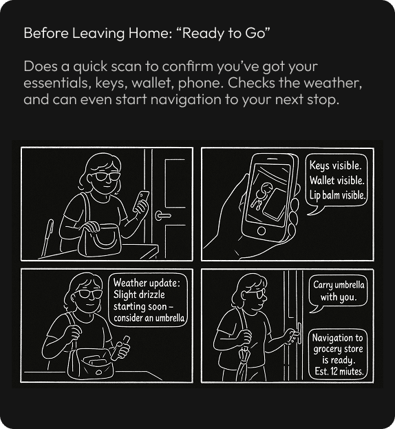 I storyboarded everyday journeys from commutes to indoor navigation to reveal “awareness gaps” where current tools fall short.
